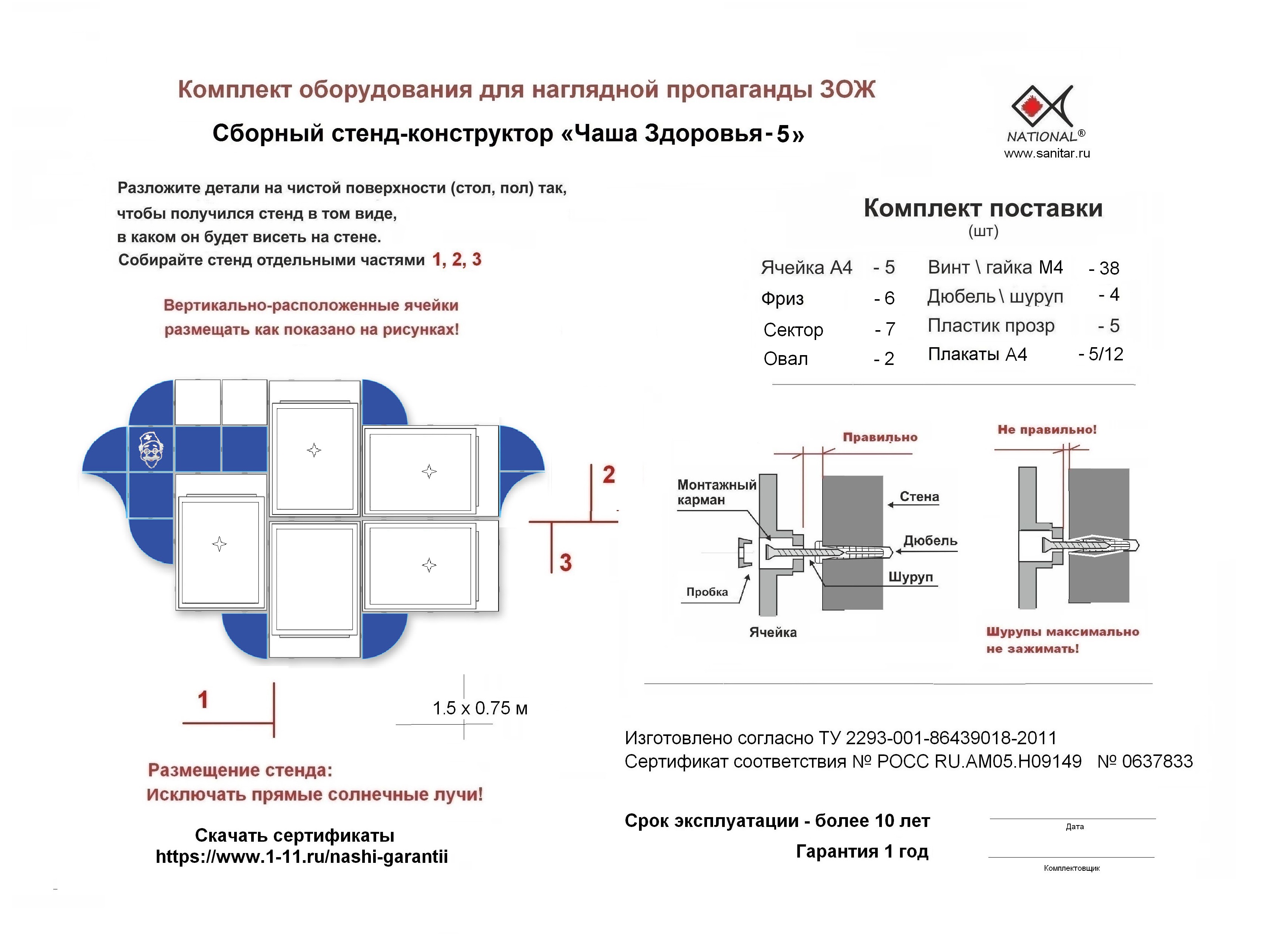 Комплект соответствует санитарно-эпидемиологическим нормам и рекомендован для использования в образовательных учреждениях и медицинских организациях. Дополнительно прилагаются сертификаты соответствия качеству и безопасности. Установка стенда осуществляется легко и быстро благодаря подробной инструкции и сборной конструкции.