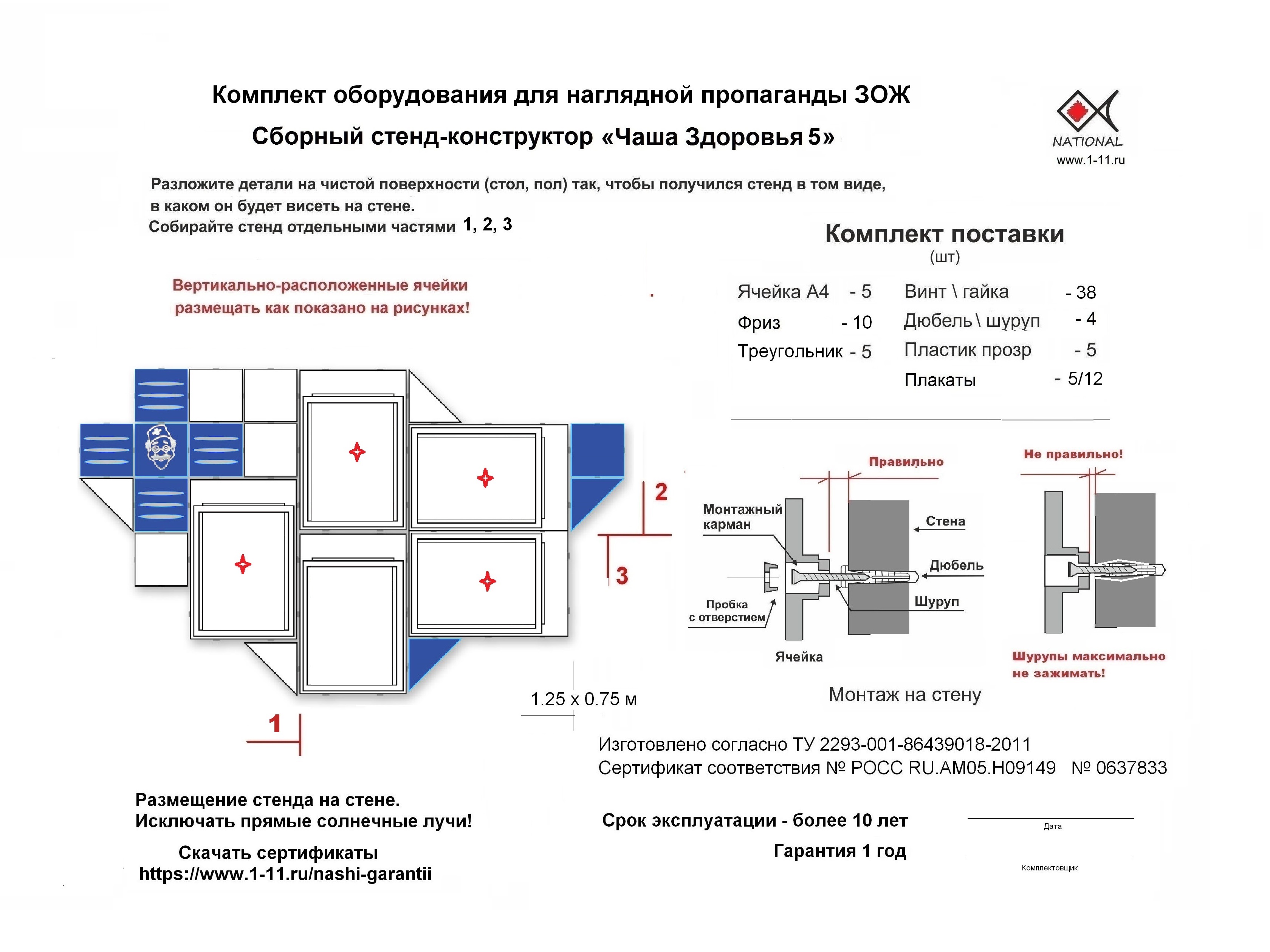 Комплект соответствует санитарно-эпидемиологическим нормам и рекомендован для использования в образовательных учреждениях и медицинских организациях. Дополнительно прилагаются сертификаты соответствия качеству и безопасности. Установка стенда осуществляется легко и быстро благодаря подробной инструкции и сборной конструкции.
