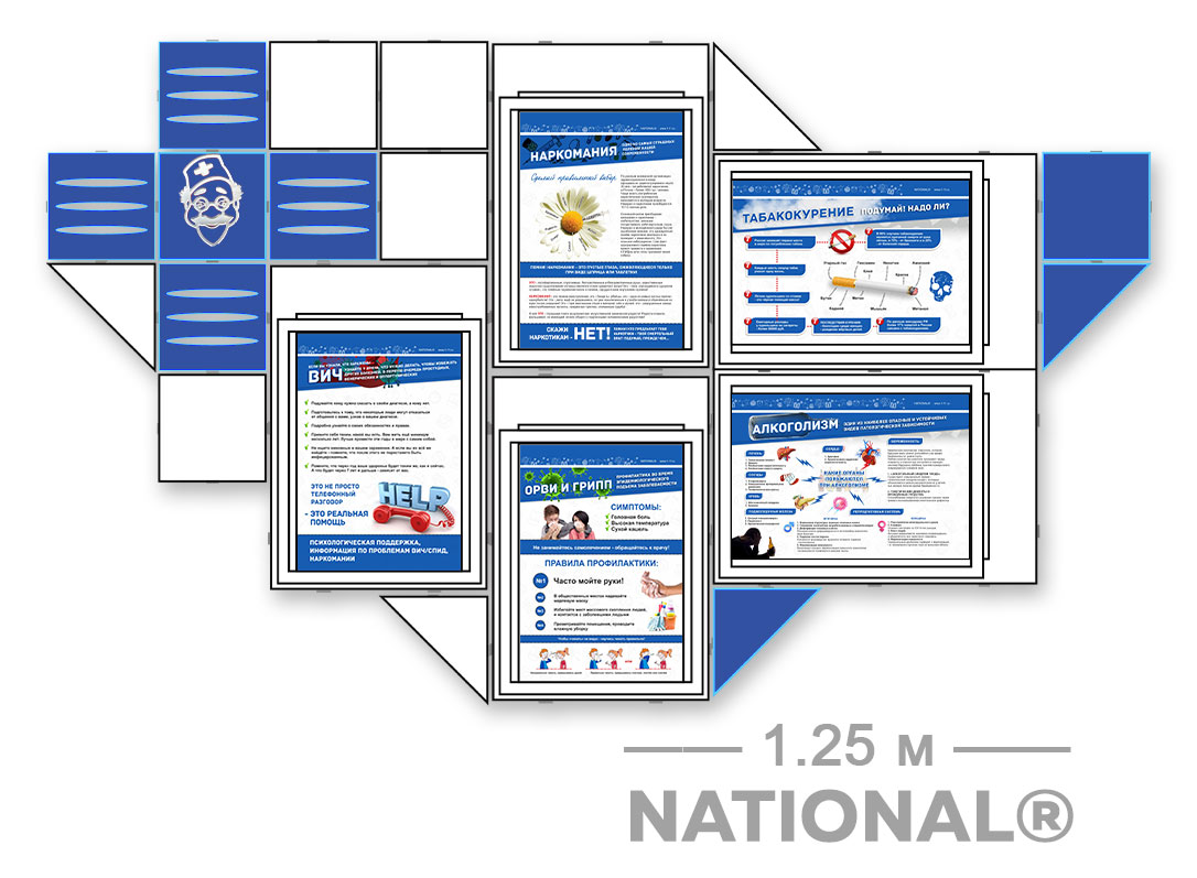 Комплект поставки: сборный стенд + набор плакатов А4: вред алкоголизма, табакокурения, профилактика ВИЧ, наркомании, Гриппа.
