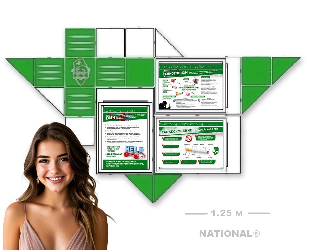 В комплект поставки входят 5 плакатов А4: Профилактика гриппа, ВИЧ, СПИДа, наркомании и алкоголизма, флажок России, межэлементный и настенный крепеж, инструкция сборки.