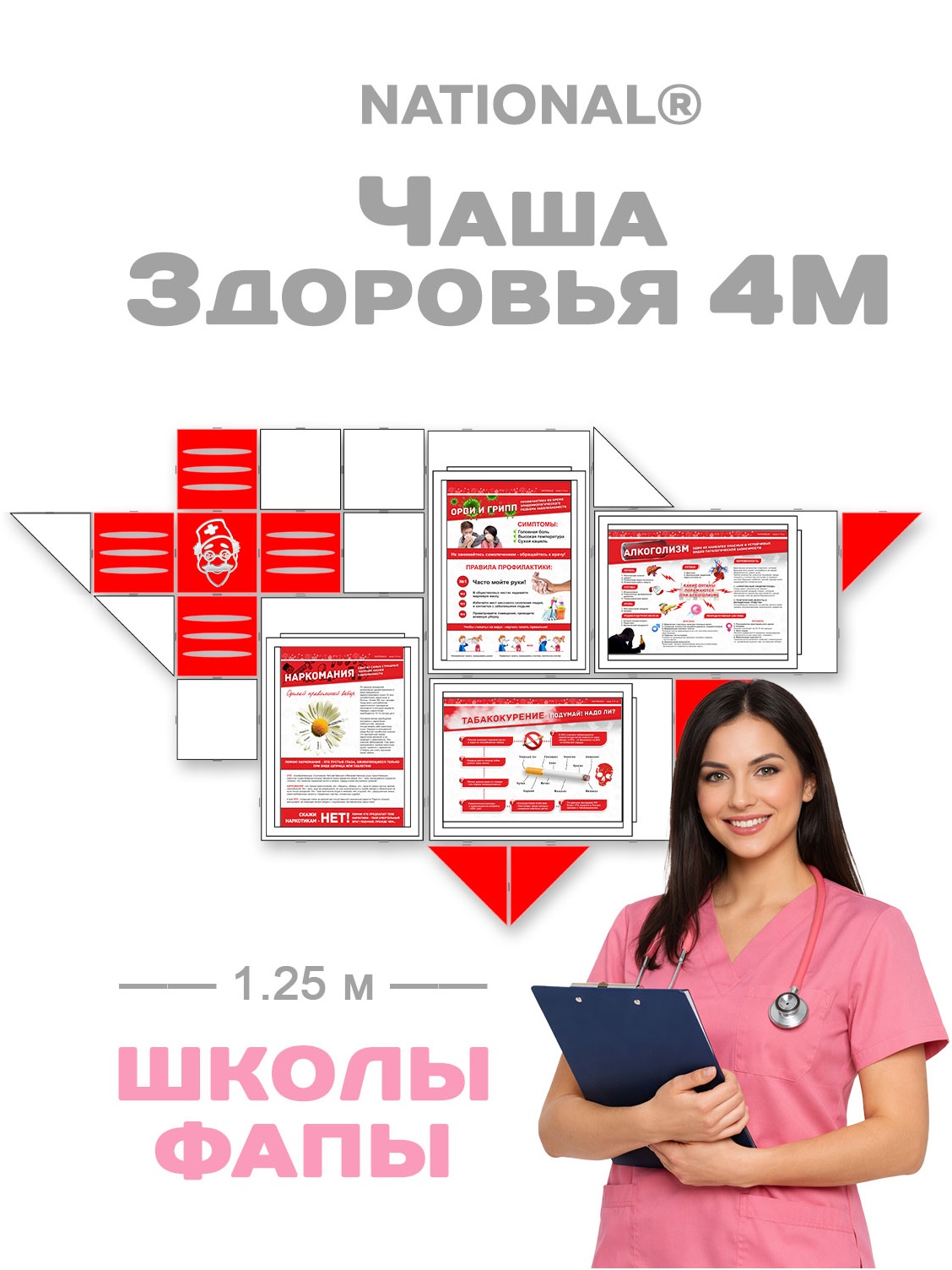 Комплект оборудования NATIONAL® для наглядной пропаганды здорового образа жизни (ЗОЖ, стенд+плакаты) для школ, ФАПов, больниц, поликлиник, др. учреждений - «Чаша Здоровья - 4М» - оптимальное решение в подборе наглядных инструментов пропаганды ЗОЖ от производственной компании НАЦИОНАЛЬ г Москва. Торговая марка NATIONAL® (НАЦИОНАЛЬ®).